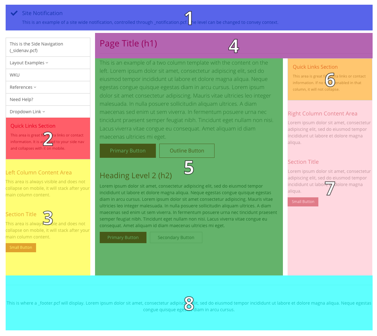 It may be difficult to visualize the orderin which content on a multi-column page layout is consumed by assistive technologies or search engines. Use this guide to determine where an out of order heading may be, as well as recommendations for heading levels inside each area. Work through each and use the recommendations to adjust heading levels or switch to styles.